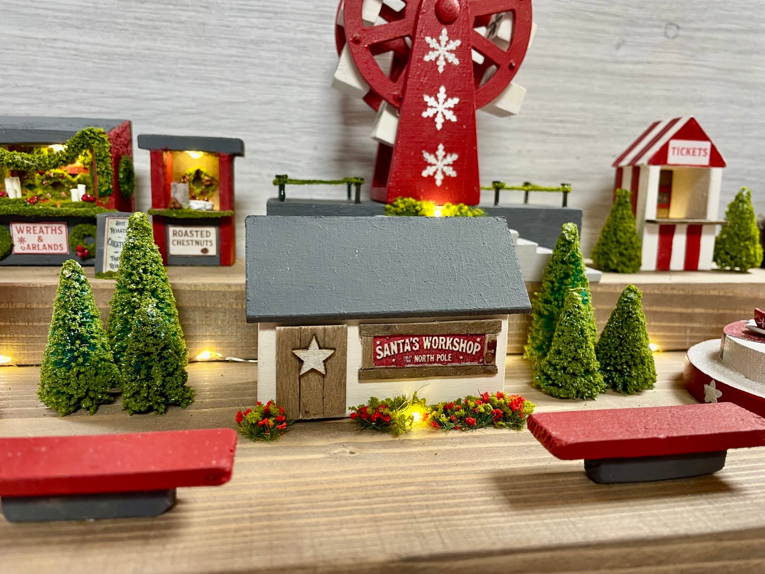 Experience the magic of Christmas with our enchanting handmade miniature Christmas fairground! Crafted from salvaged wood, each detail brings the spirit of Christmas alive. Featuring a big wheel, a charming carousel, cute tea cup ride and Santa’s workshop. There’s plenty of stalls to get your tickets, mulled wine, roasted chestnuts and christmas garlands. With the fairground scene all aglow with battery operated twinkling micro lights. Perfect for adding rustic charm to your holiday decor or gifting a one-of-a-kind treasure.