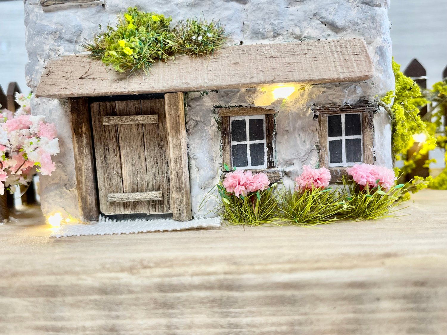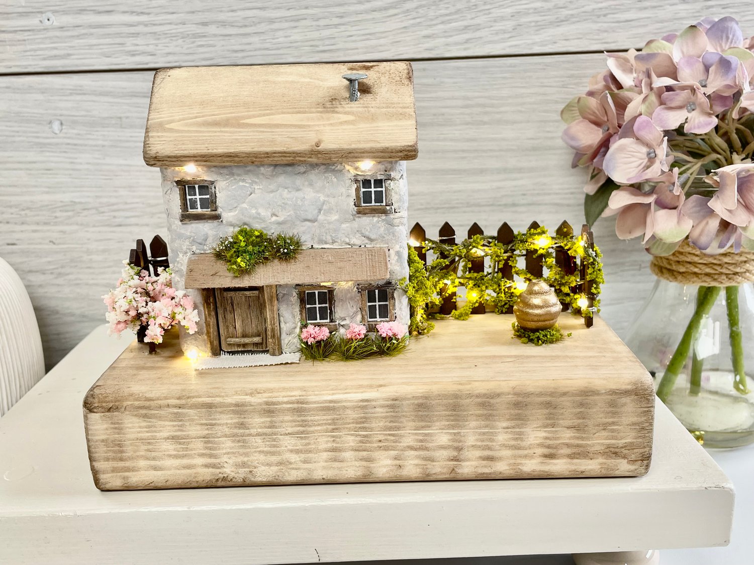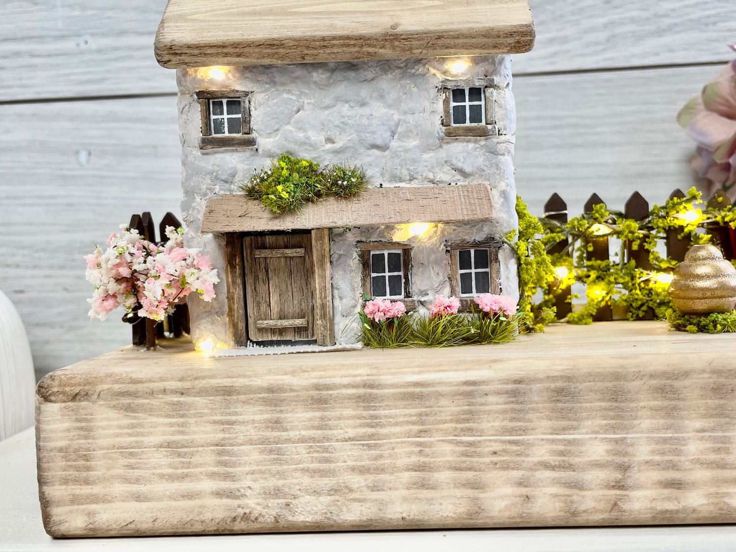 This charming handcrafted miniature cottage features a rustic stone-textured facade with a rustic wooden front door. The roof is made from reclaimed wood, adding to the rustic aesthetic, with a tiny nail as a whimsical chimney. Surrounding the cottage is a garden scene with small trees, bushes, and flowers. Warm white LED lights are delicately strung around the house and garden fence, creating a cozy and inviting glow. There’s also a picket fence, cherry blossom tree and flower pots adding to the sense of a peaceful home.