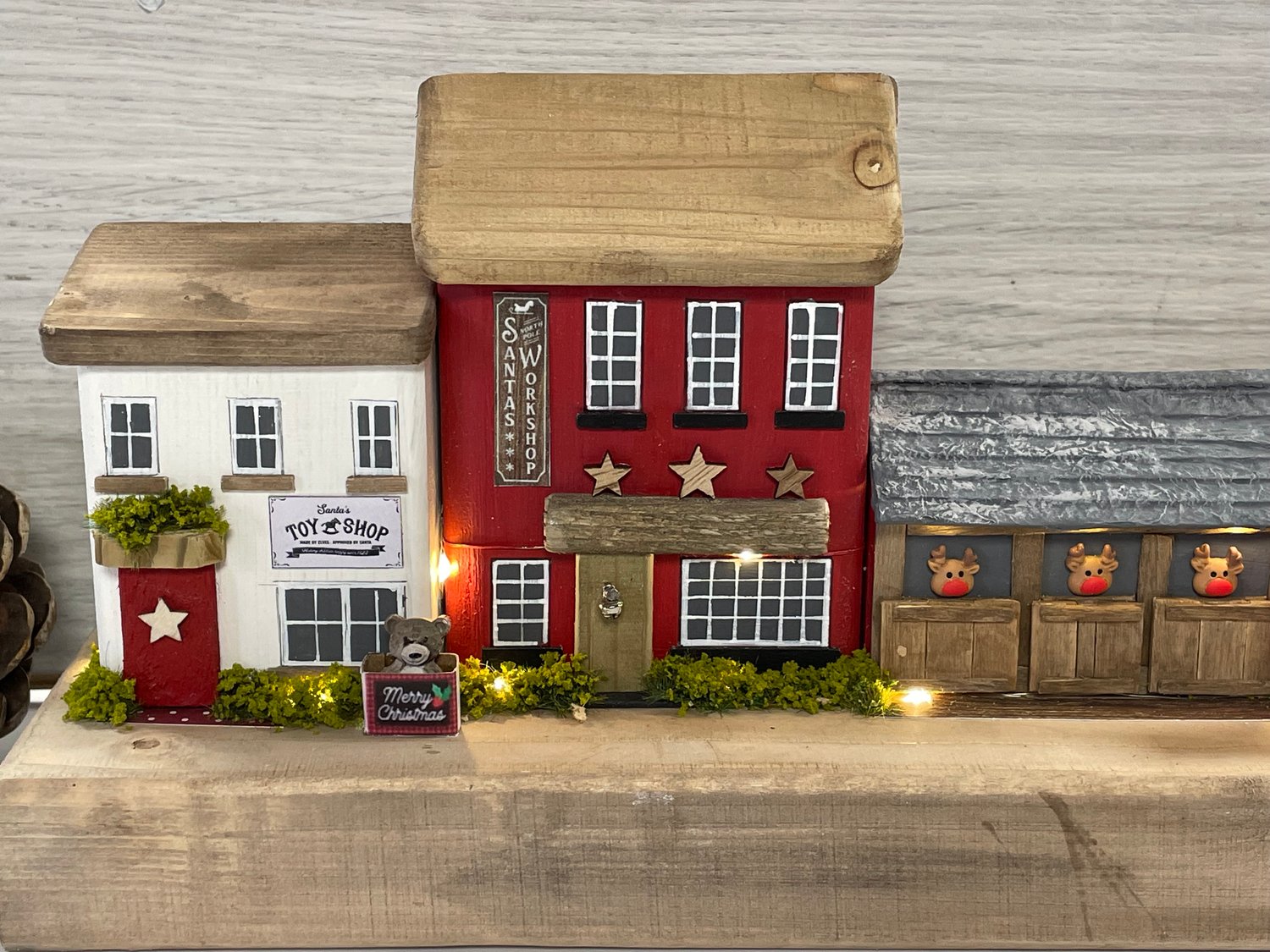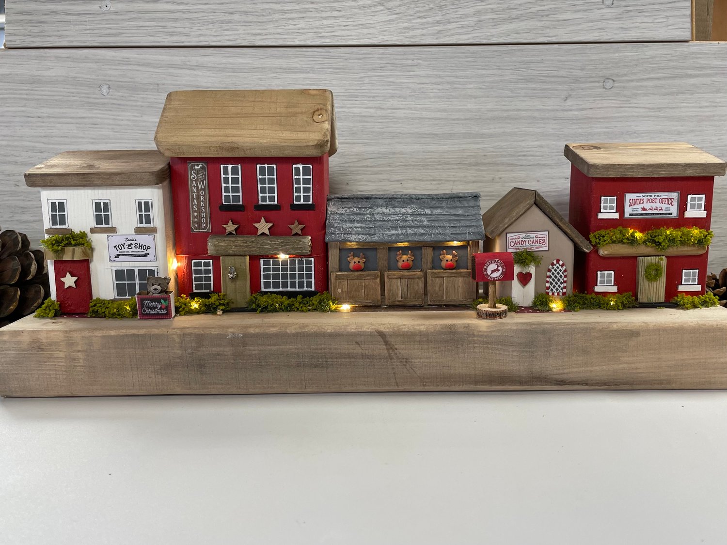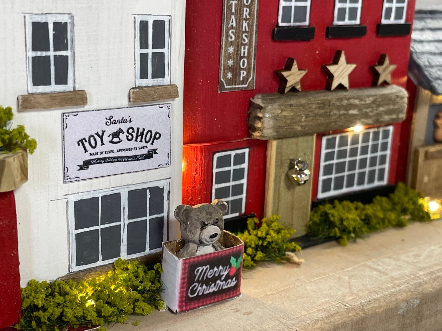 Add a touch of holiday magic with this handmade miniature Christmas street scene. This charming little scene crafted from salvaged wood and hand painted with love, captures a whimsical festive village.